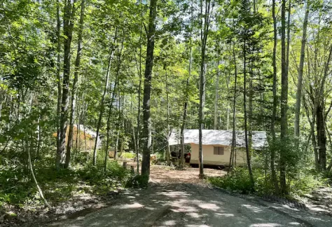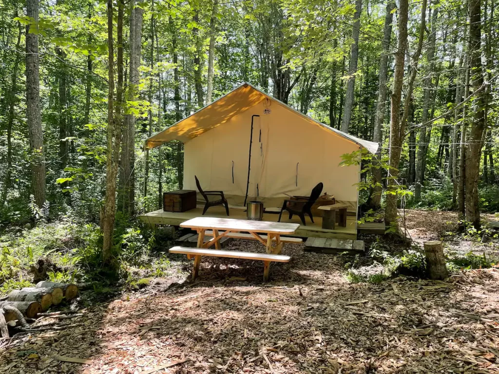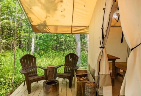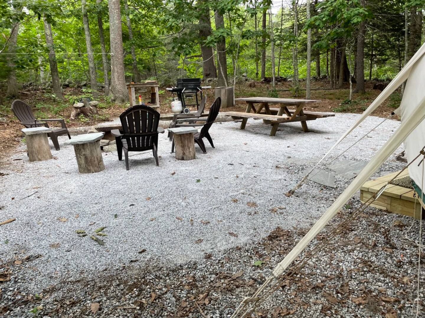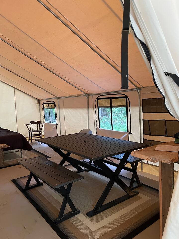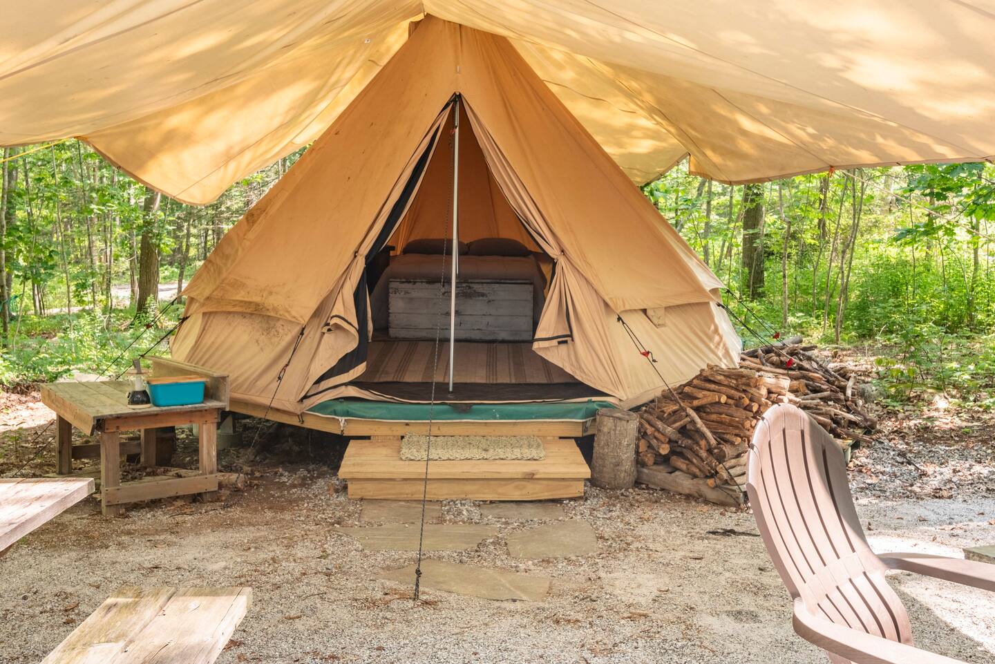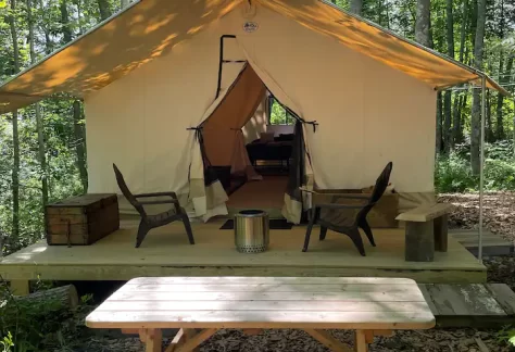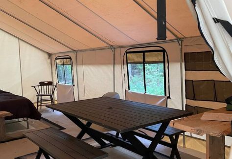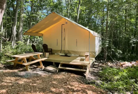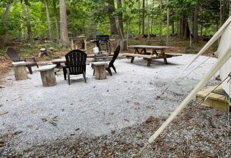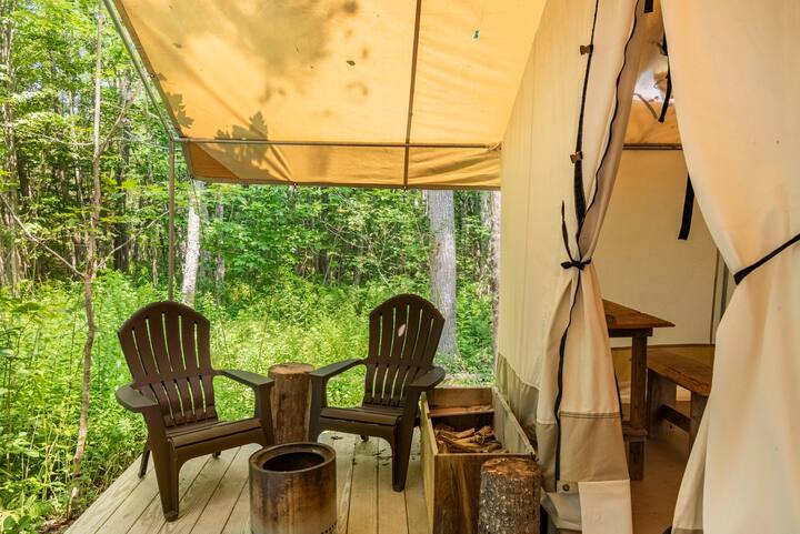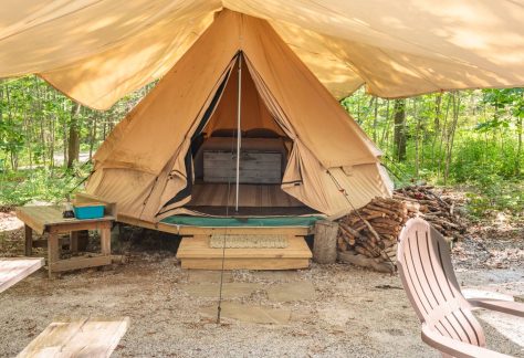 Look no further if you would like to wake up in the woods and enjoy all the amenities Mother Nature and Thistledown Farm has to offer. The Pemaquid is a large safari-style tent tucked away in a peaceful wooded setting. Come get away from it all and enjoy the peace and quiet that Thistledown Farm has to offer. You’ll have your own firepit and an endless supply of free firewood!