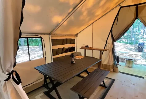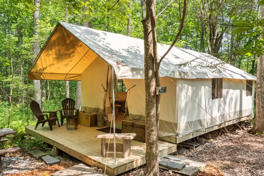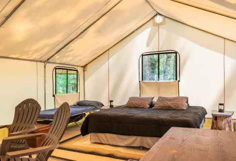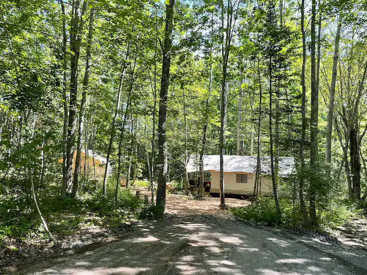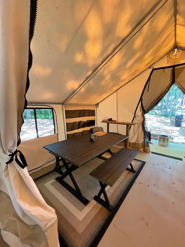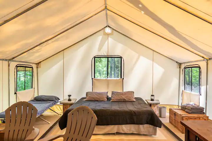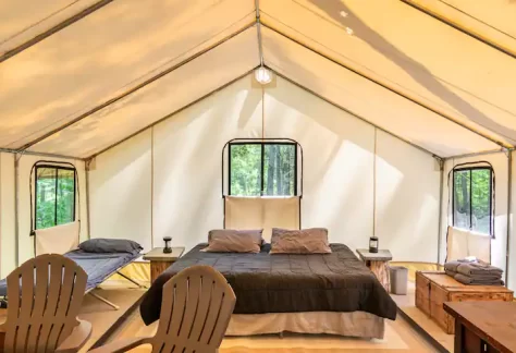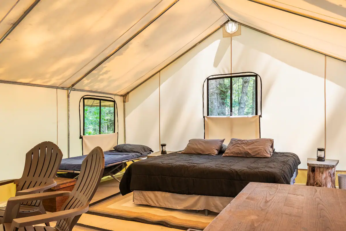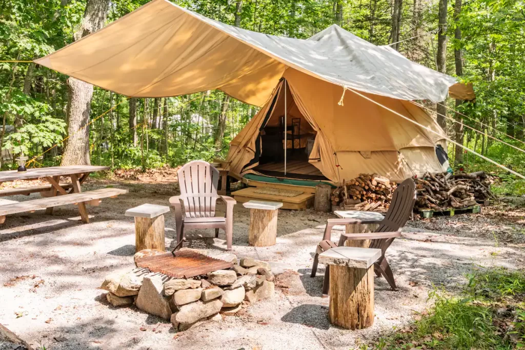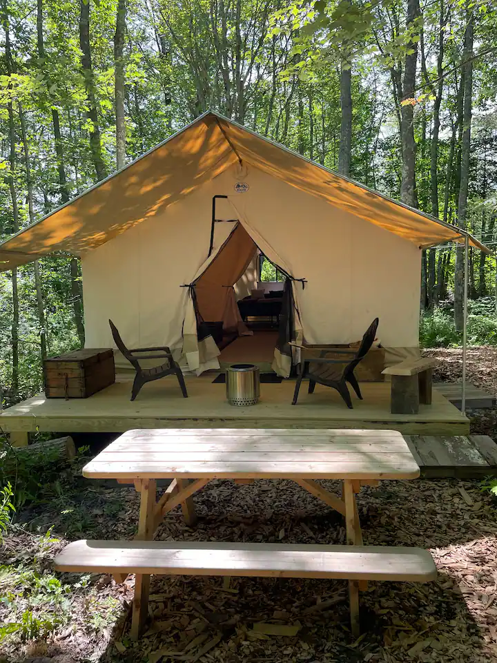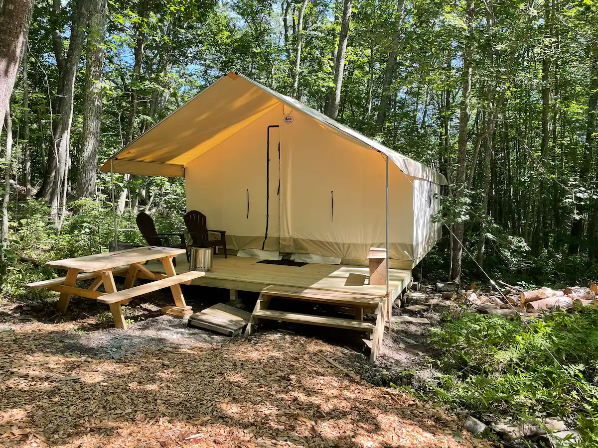 Look no further if you would like to wake up in the woods and enjoy all the amenities Mother Nature and Thistledown Farm has to offer. The Pemaquid is a large safari-style tent tucked away in a peaceful wooded setting. Come get away from it all and enjoy the peace and quiet that Thistledown Farm has to offer. You’ll have your own firepit and an endless supply of free firewood!
