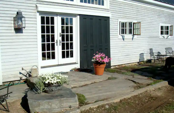 Thistledown Farm’s Udder Heaven occupies the entire ground floor of a repurposed 1800’s barn. Post and beam throughout, with barn board floors & walls, it is tastefully appointed with period antiques. The open plan design incorporates the living, dining, and kitchen areas. A parlor-style wood stove, french doors, and old store counter kitchen center island help set the scene. The front doors open to a large private terrace and garden. There are 2 bedrooms, a full bath, and a laundry room.